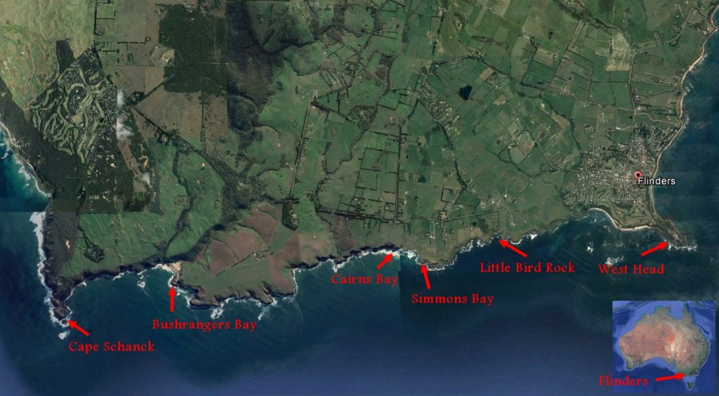 Flinders is a Dana locality southeast of Melbourne, Victoria, best known for producing large crystals of gmelinite. The basalts are part of the Older Volcanics with a flow near the top of the sequence dated at 42 million years. Zeolites and associated mineralisation occur in vesicles in basalt along the coastline.