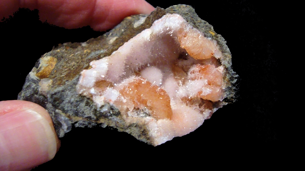 Siderite: Recorded as crystals up to 3mm long with chabazite and montmorillonite.