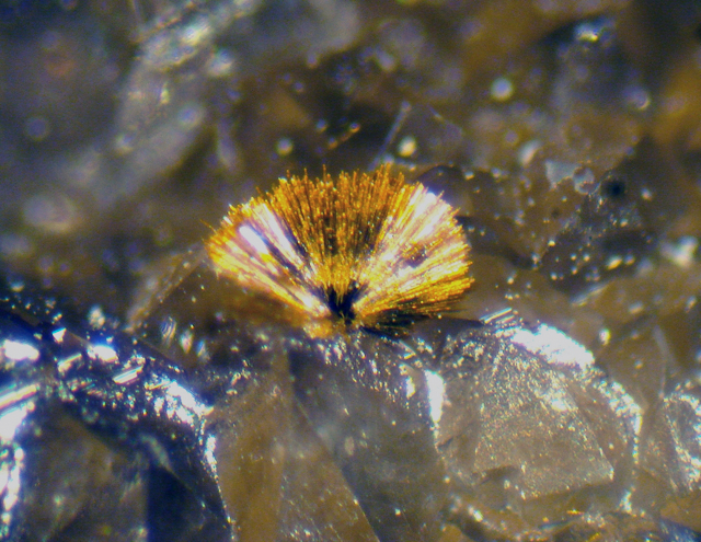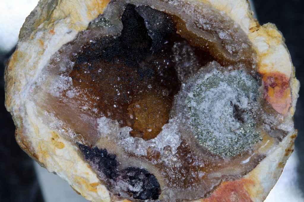 These smaller “geodes” are also interesting, as they sometimes host occasional pyrite blebs that appear to have formed before the quartz, or, more commonly, goethite to a few millimetres in size, as either golden or brown tufts, or black, iridescent spheres, formed after the quartz.